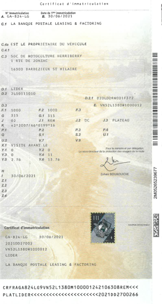 Certificat d'immat. :
